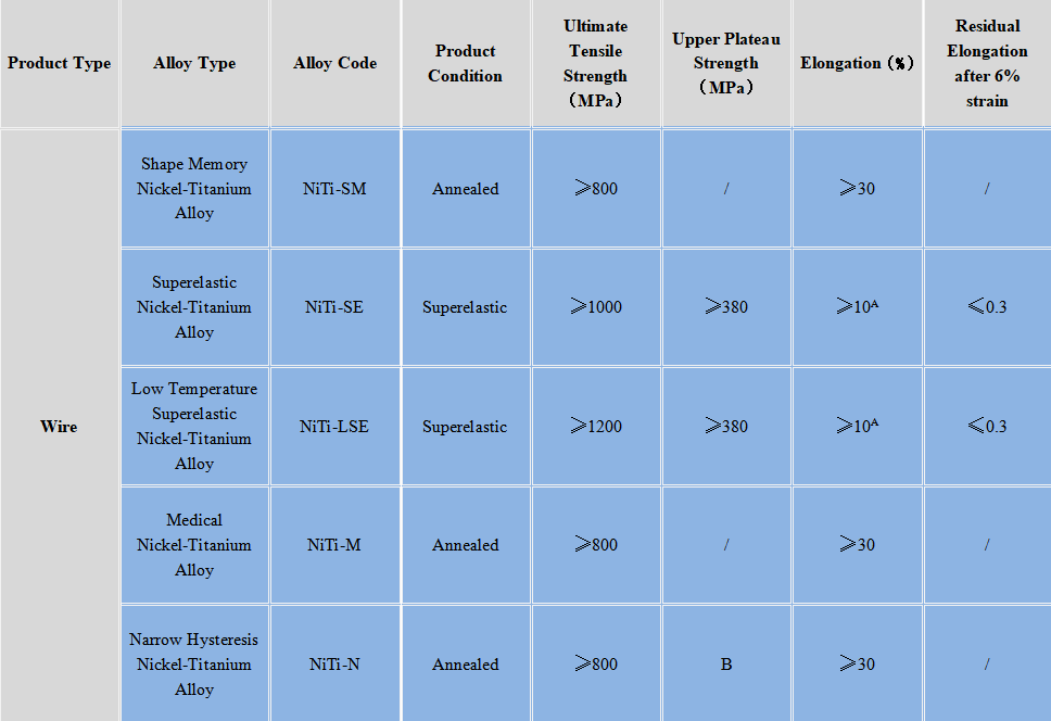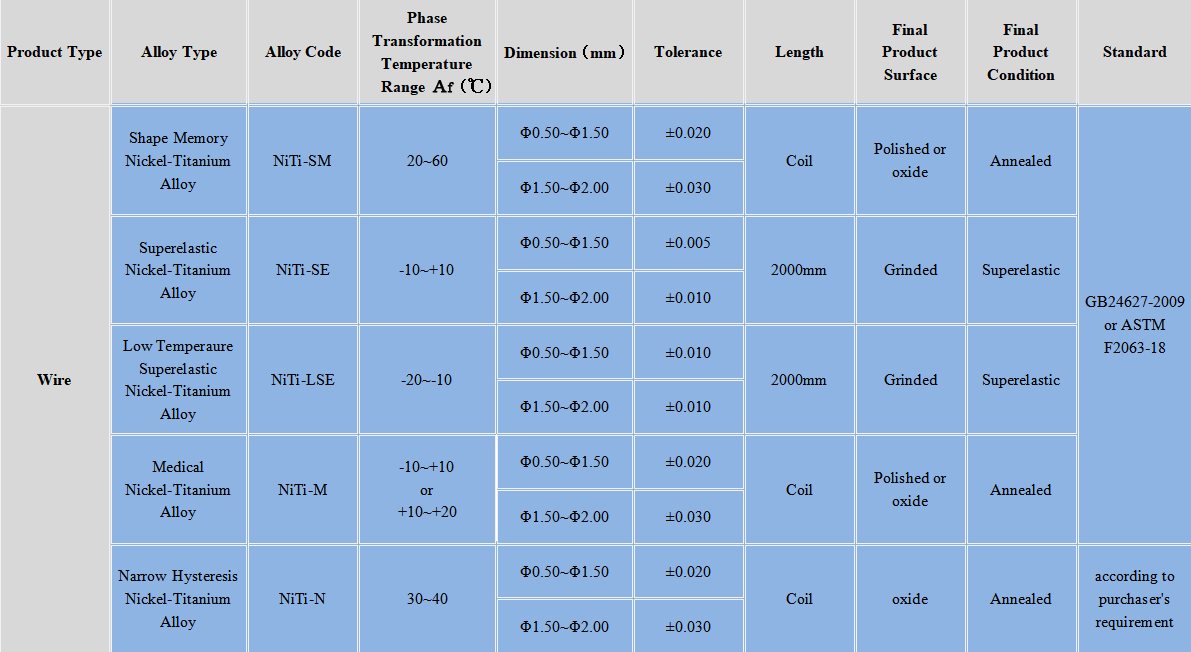 1. Medical Nickel-Titanium Alloy means it is most commonly used for medical. Other alloy types listed in the table are also can be used for medical.