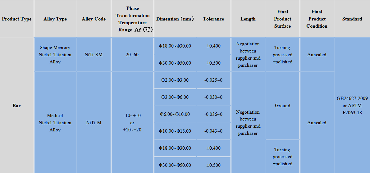 1. Medical Nickel-Titanium Alloy means it is most commonly used for medical. Other alloy types listed in the table are also can be used for medical.