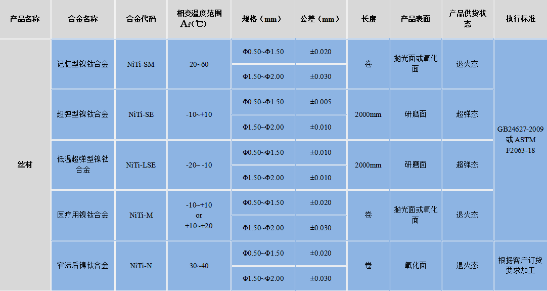 “医疗用镍钛合金”指医疗常用的镍钛合金,表中其他牌号的镍钛合金也可用于医疗行业。2.如有其他要求可以协商。
