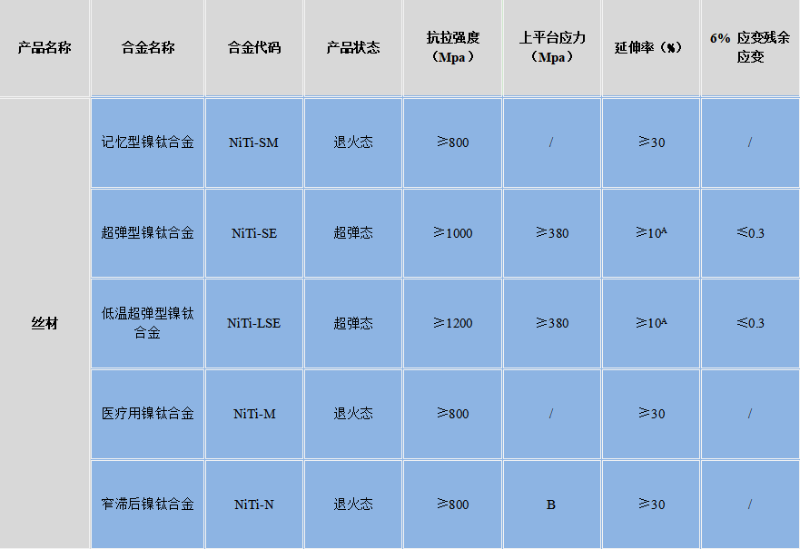 1.“医疗用镍钛合金”指医疗常用的镍钛合金,表中其他牌号的镍钛合金也可用于医疗行业。2.如有其他要求可以协商。